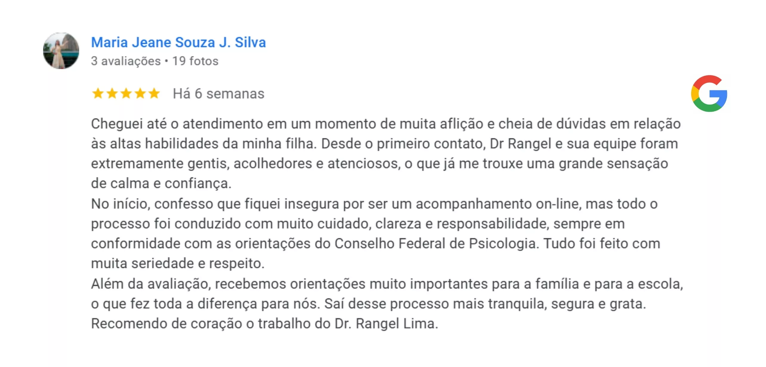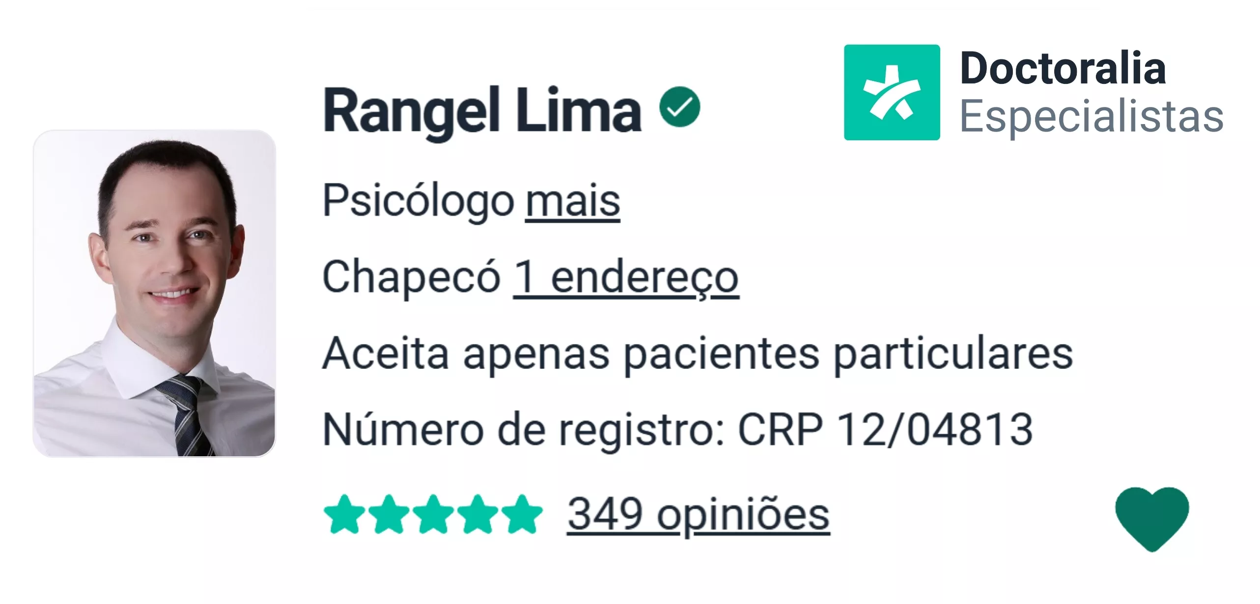 Olá, sou Rangel Lima, Psicólogo Especialista em Avaliação Neuropsicológica, Psicoterapia Cognitiva Comportamental e Psicologia Clínica, com mais de 24 anos de experiência. Atuei como professor universitário em avaliação psicológica e neuropsicológica, além de perito avaliador no DETRAN e na Polícia Federal.